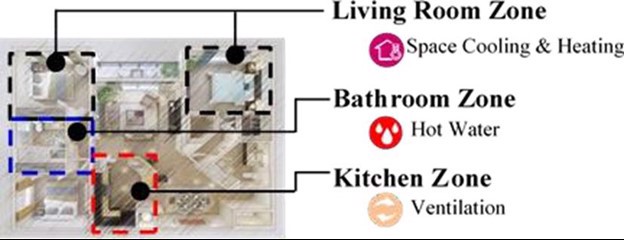 Bij de start van een traject worden de eigenschappen van de woningen in kaart gebracht en dient het doel van de ontwikkelaar achterhaald te worden. Zoals te zien in de onderstaande afbeelding, zijn de woonkamer, de badkamer en de keuken de drie belangrijkste ruimtes van een woning. Elke ruimte heeft eigen, verschillende HVAC-vereisten. Tegelijkertijd kan de klant ook eigen wensen of behoeften hebben. De projectontwikkelaar is verantwoordelijk voor de bouw en haalt zijn winst uit de verkoop en/of verhuur. Als het gebouw aan de wensen van de klant voldoet, wordt op die manier de waarde van het gebouw hoger. Een optimaal voorstel levert uiteindelijk een verhoogde waarde op.